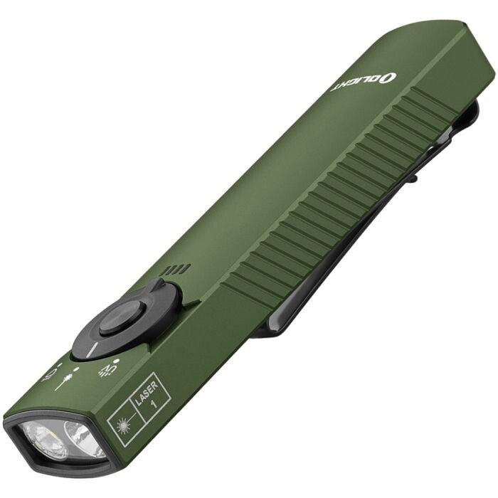 Dimensions: 4.72" x 0.63" x 1.06". Water resistant. Impact resistant. Strobe. Rechargeable. Cool white LED. Green beam. UV light. Modes: Turbo (1300-420 lumens, 4+126m runtime); High (420-100 lumens, 135+12m runtime); Medium (100 lumens, 9h 45m runtime); Low (15 lumens, 55h runtime); Moon (1 lumen, 11 days runtime). MCC1A magnetic USB charging. 102m beam distance. Requires (1) Lithium battery (included). Aluminum construction. Color: OD Green. Boxed.