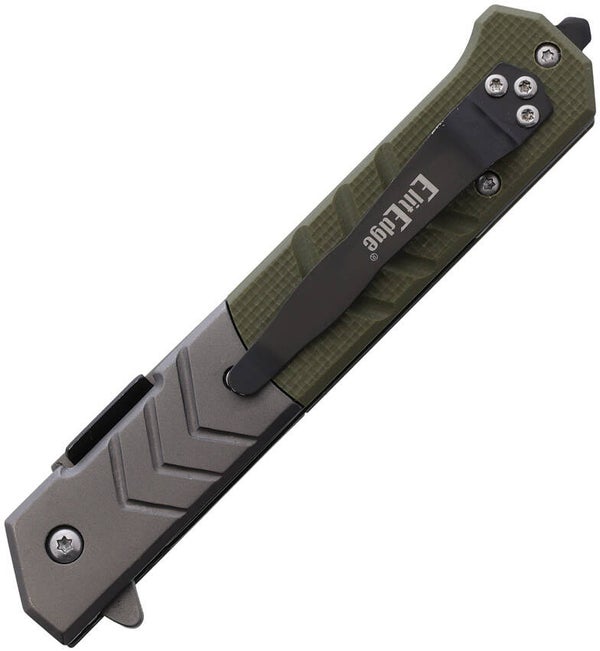 Assisted opening. 5.13" (13.03cm) closed. 4" (10.16cm) gray titanium coated 420C stainless blade. Green G10 handle. Stainless bolster(s). Glass breaker. Extended tang. Pocket clip. Boxed.