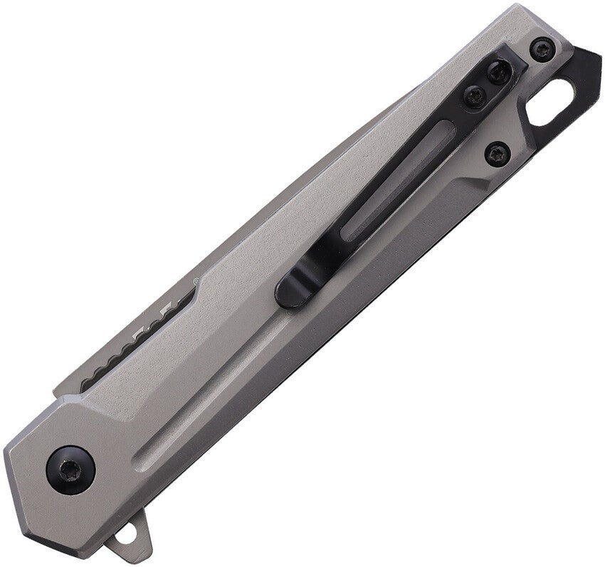 Assisted opening. 4.88" (12.4cm) closed. 3.75" (9.53cm) satin finish stainless blade. Gray stainless handle. Lanyard hole. Glass breaker. Extended tang. Pocket clip. Boxed.