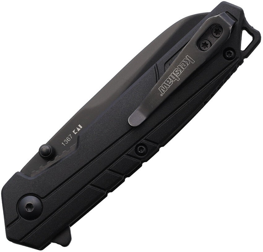 Assisted opening. 4.25" (10.8cm) closed. 3" (7.62cm) black oxide coated stainless sheepsfoot blade. Black nylon handle. Thumb stud. Lanyard hole. Pocket clip. Boxed.